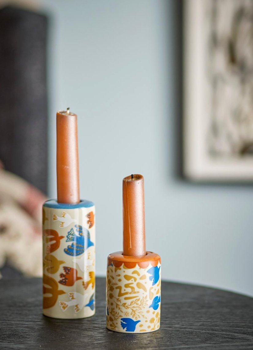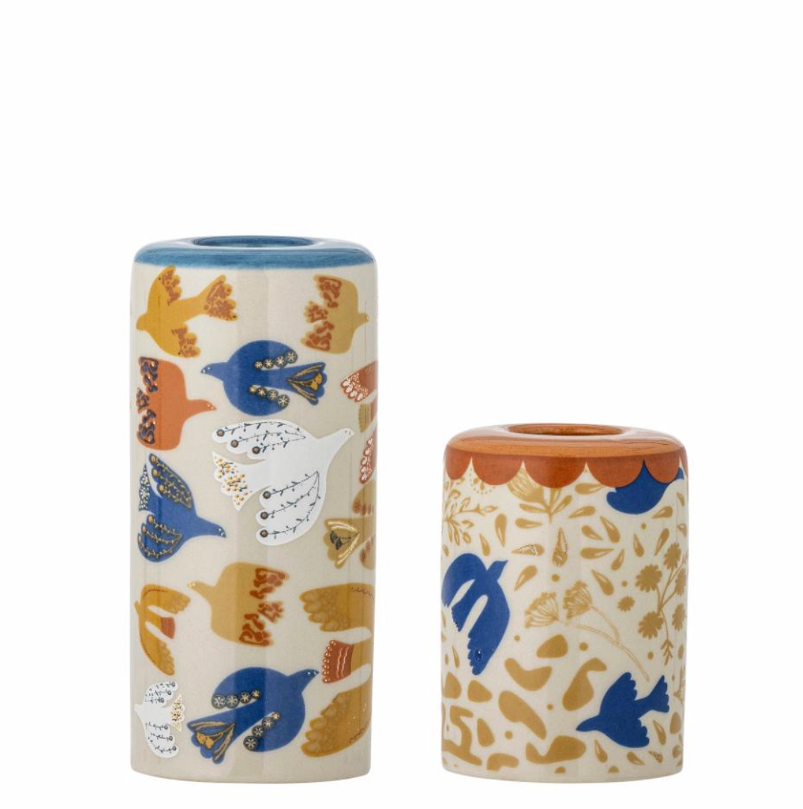 Les Bougeoirs Anniversaire de Bloomingville sont présentés en lot de deux et sont fabriqués en grès avec un motif graphique imprimé dans des couleurs chaudes. Les différentes hauteurs et le design illustratif créent un look vibrant et décoratif - beau à la fois ensemble et séparément.