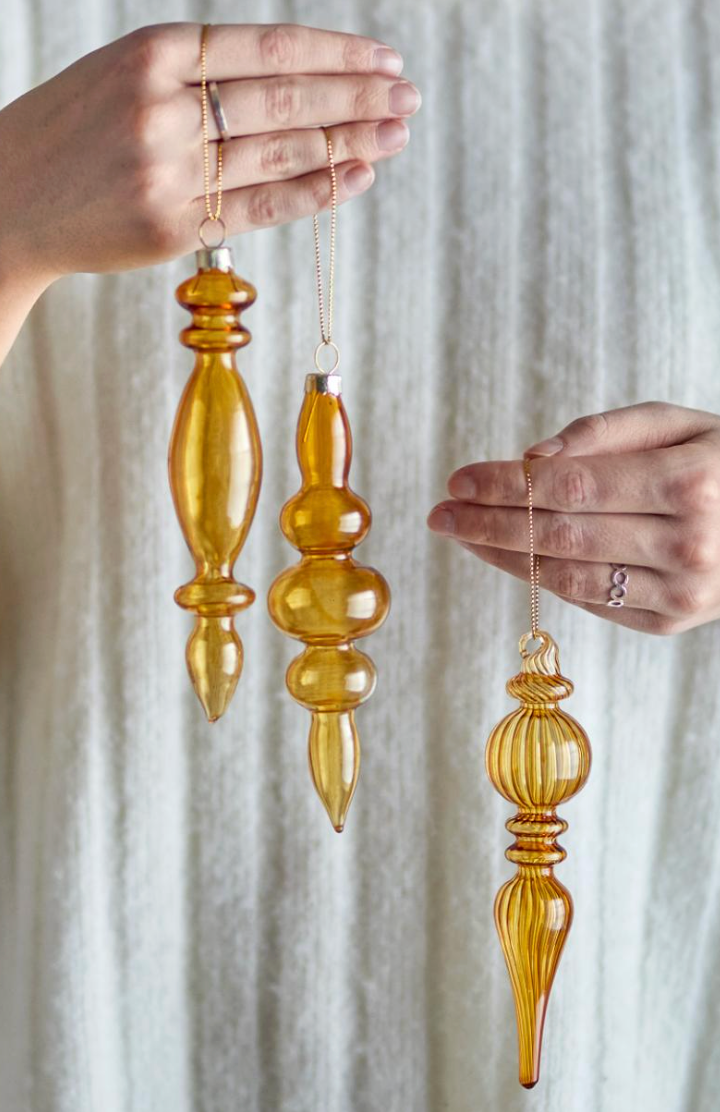Le Bibelot Auralia de Bloomingville est un ensemble de trois suspensions élégantes en verre soufflé à la bouche et façonné à la main, de couleur dorée. Avec leurs belles formes et leur design délicat, ils ajoutent une touche sophistiquée aux décorations de l'arbre de Noël ou des fenêtres. Chaque ornement est équipé d'un cordon doré fin pour un accrochage facile, et les détails faits à la main rendent chaque pièce unique.