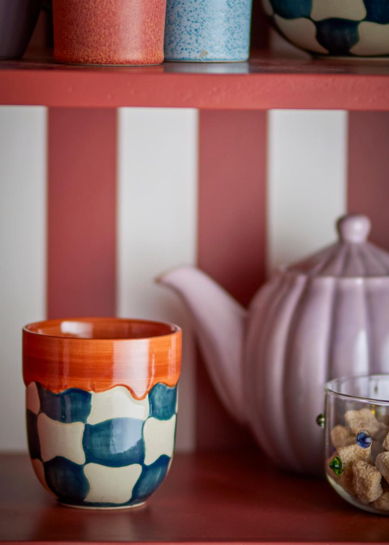 La tasse Check de Bloomingville est présentée dans un set de quatre et est fabriquée en grès. Les tasses sont peintes à la main avec un motif graphique en damier dans des tons bleus et clairs et ont un bord chaud et rougeâtre sur le dessus. Le motif peint à la main fait en sorte que chaque tasse est unique.