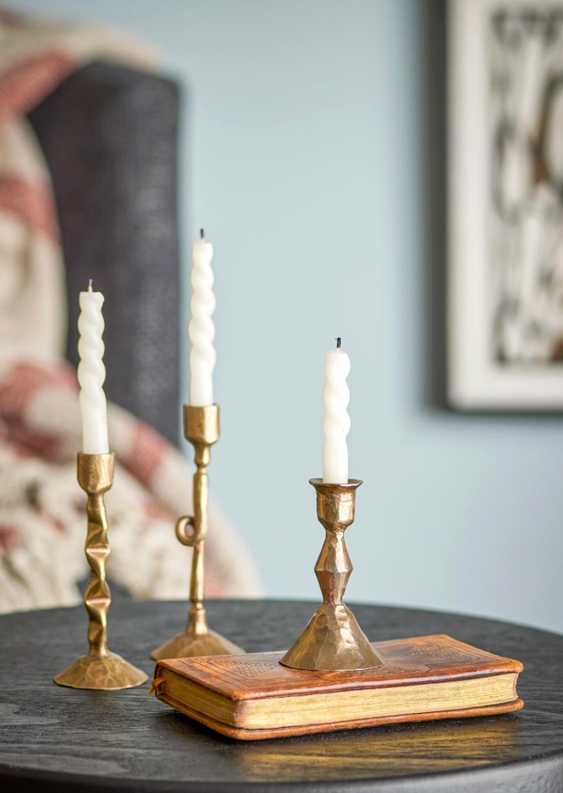 Les Bougeoirs Efsa de Bloomingville sont un ensemble de 3 en métal couleur laiton avec une surface légèrement patinée. Chaque bougeoir a son propre caractère et ajoute une expression vibrante, qu'il soit placé ensemble ou séparément.