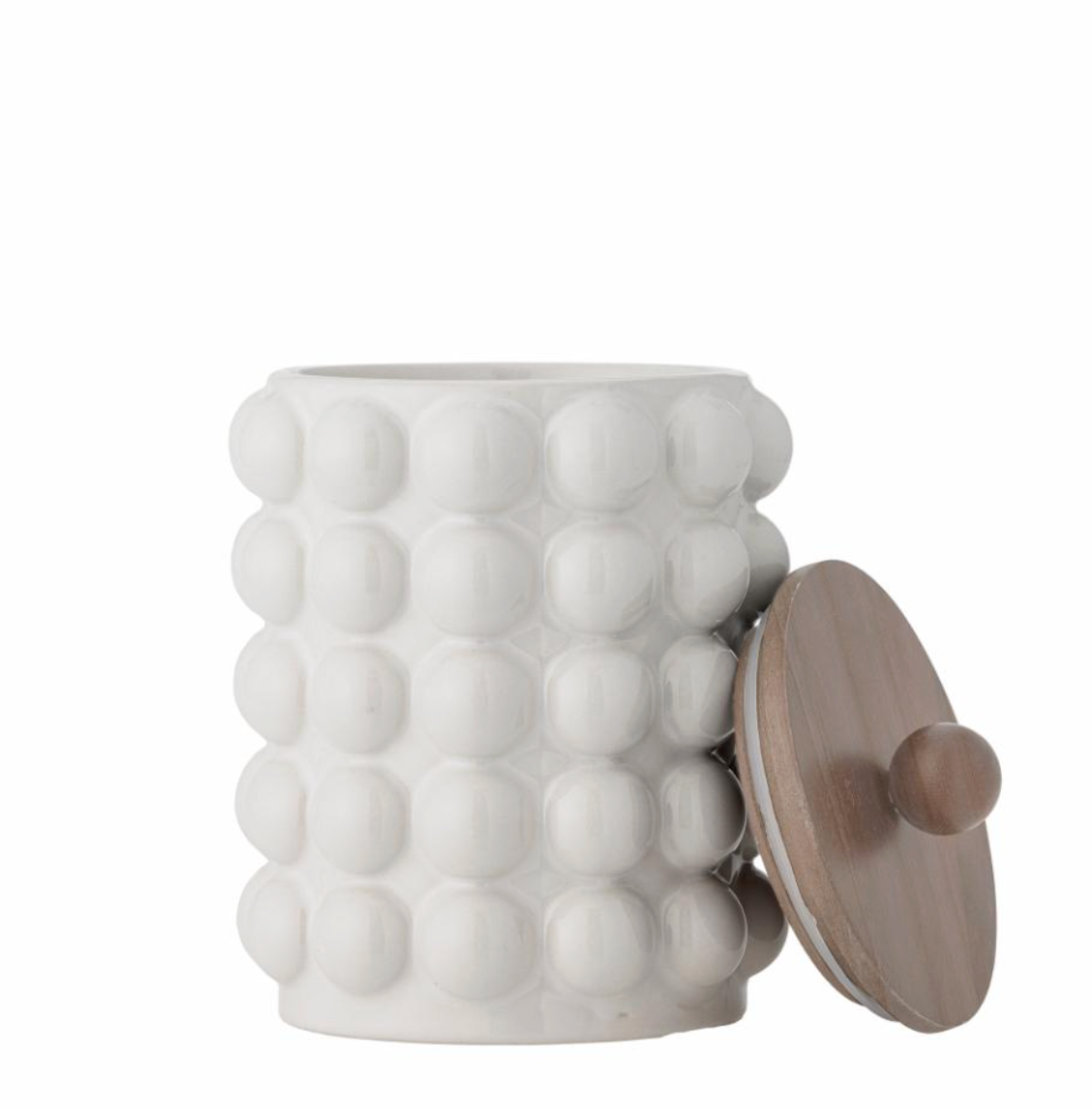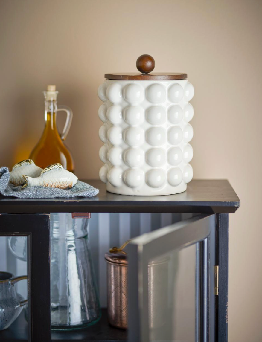 La Jarre Madge avec couvercle de Creative Collection est fabriquée en grès avec une surface bulleuse et un couvercle en bois d'acacia. Le couvercle est doté d'un bord en silicone pour une fermeture hermétique - parfait pour le stockage dans la cuisine.