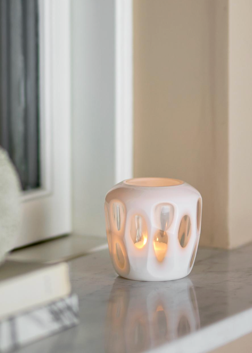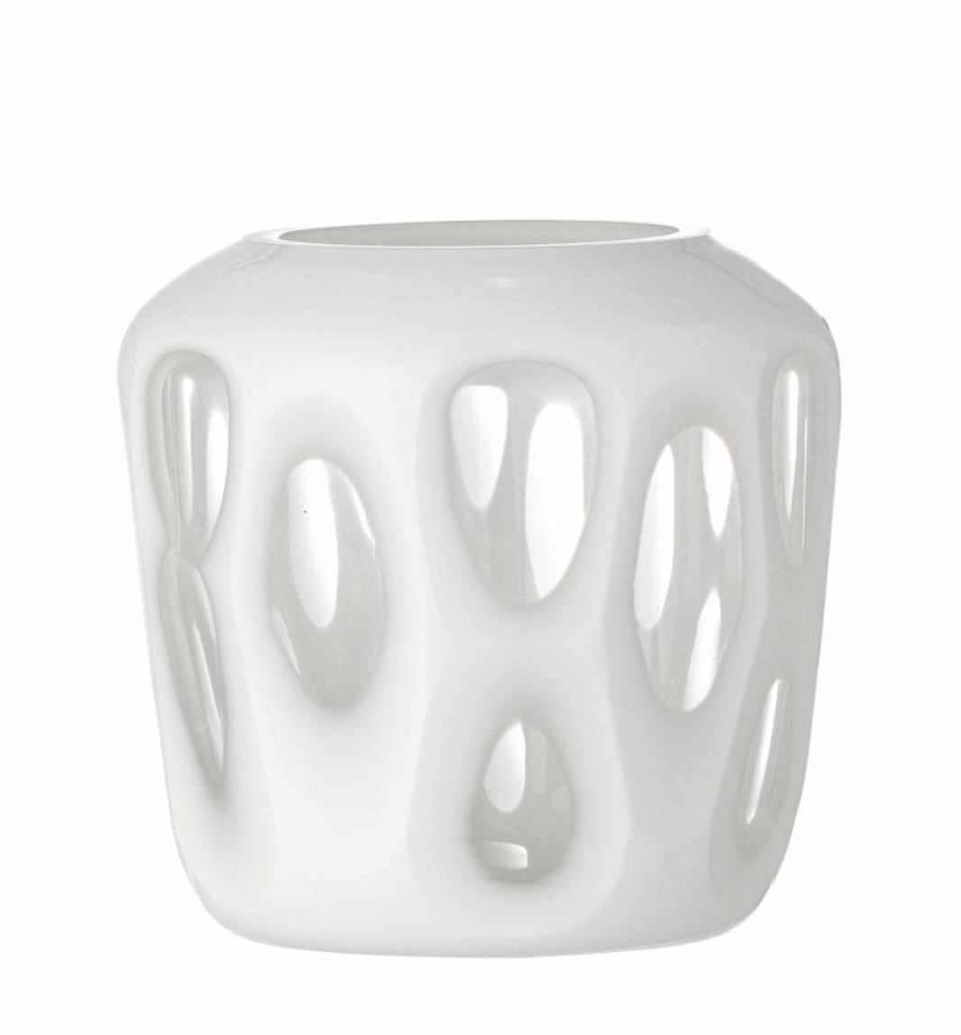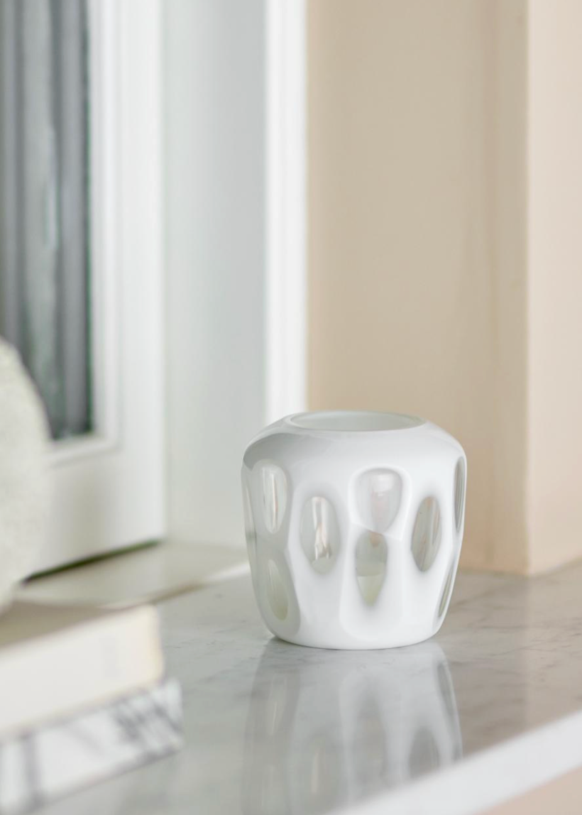 Le Bougeoir Rohan de Bloomingville est fabriqué en verre recyclé dans une belle couleur blanche. Les champs en forme de goutte d'eau dans le verre sont transparents et créent un délicat jeu de lumière. Chaque bougeoir est soufflé à la bouche et peut varier légèrement dans son expression.