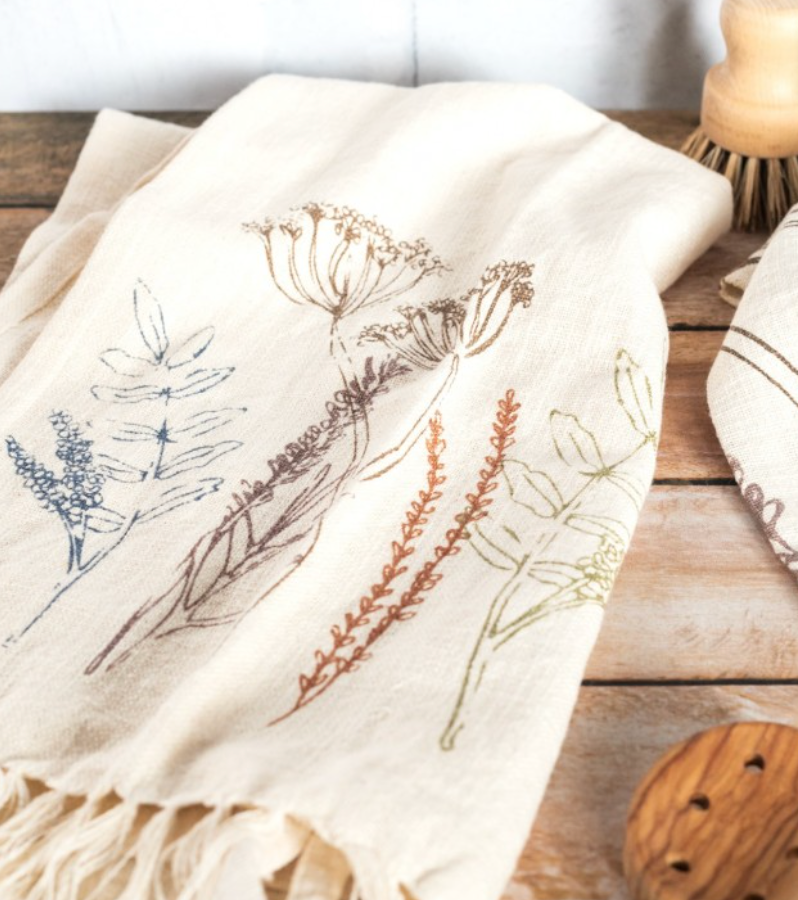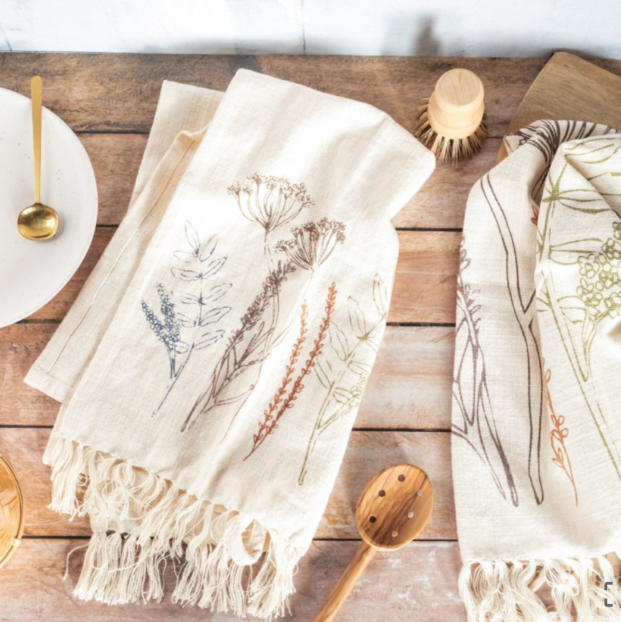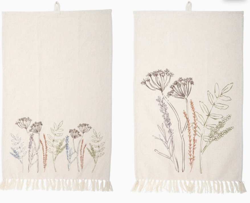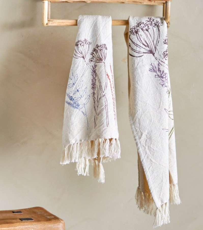 Un set de deux torchons de cuisine imaginés par la marque danoise Bloomingville. Fabriqués en coton dans une nuance douce et naturelle, ils sont décorés d'un motif floral poétique. Petit détail qu'on adore : les extrémités des torchons sont ornées de franges.