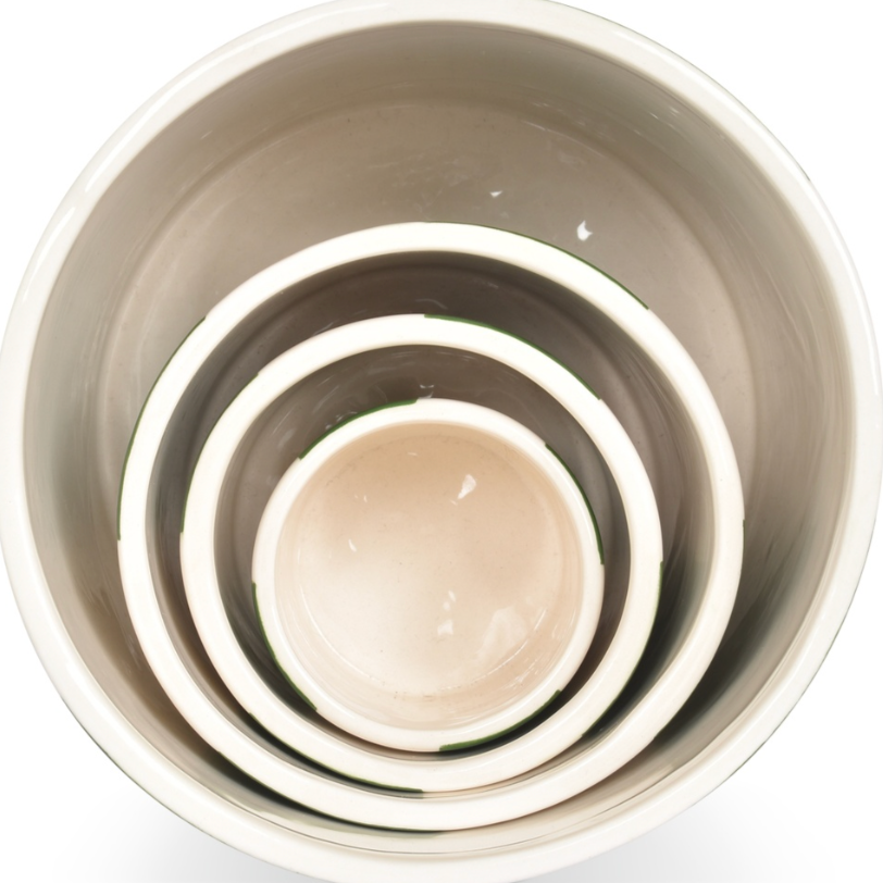 Série de 4 pots en céramique, idéal pour du rangement dans la salle de bain, cuisine ou encore en cache-pot ou vase. Dimensions : D14 H14cm, D10 H10cm, D8 H8cm, D6 H6cm.