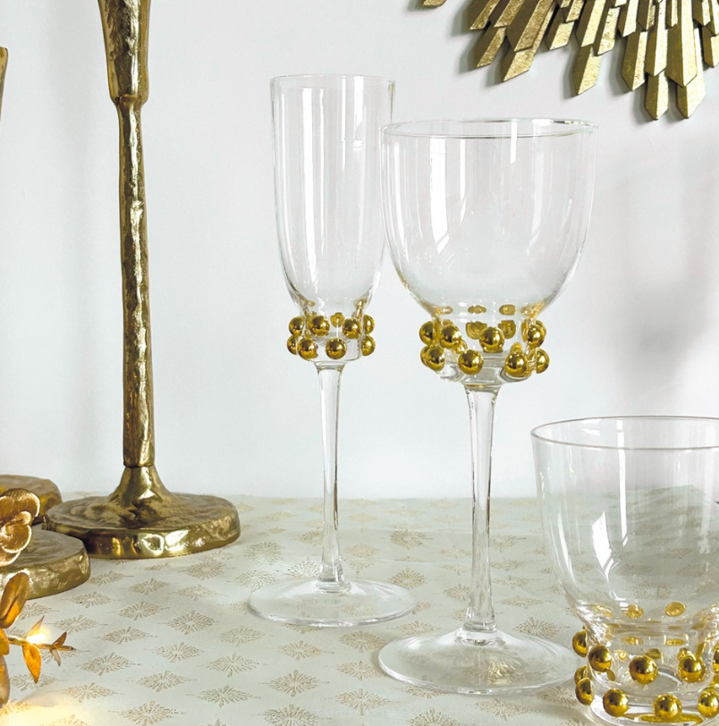Un verre transparent, orné de délicates rangées de petites billes dorées à sa base. Un design simple